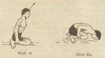 Ðộng tác : Hít vô tối đa; giữ hơi và dao động qua lại từ 2 - 6 cái; thở ra triệt để và cúi đầu xuống đụng giường. Ngồi dậy , hít vô tối đa và tiếp tục làm như thế từ 2 - 5 hơi thở. (Hình 41, 41a).